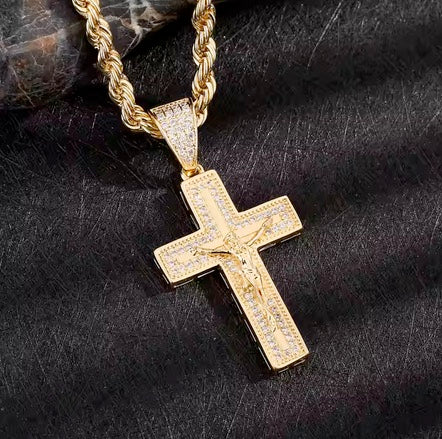 18K Gold Plated Cubic Zirconia Big Cross on Stainless Steel Necklace
