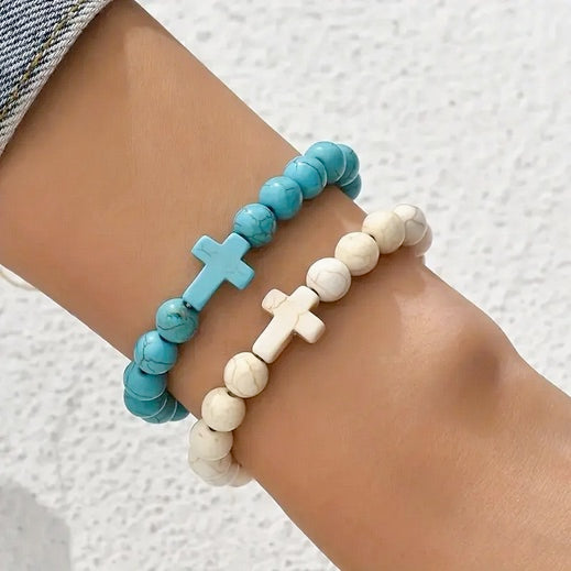 Elegant 2pcs Turquoise & White Pine Stone Cross Bracelet Set