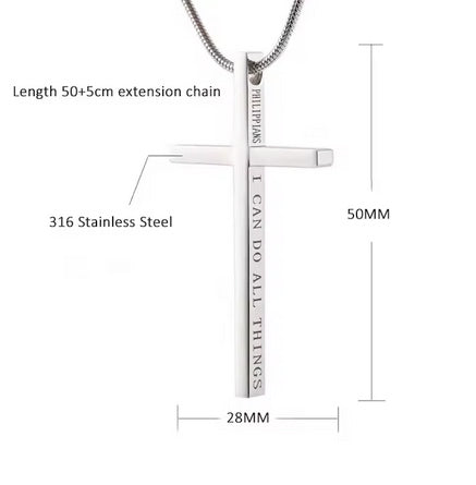 Philippians Bible Verse On Side of cross: "I Can Do All Things" - Nice 20 inch Collarbone neck chain. Three colors to pick from!