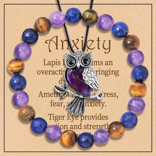 2-Piece Women's Jewelry Set, Amethyst, Tiger Eye And Lapis Natural Stone Anxiety Relief Owl Necklace and Beaded Energy Stretch Bracelet